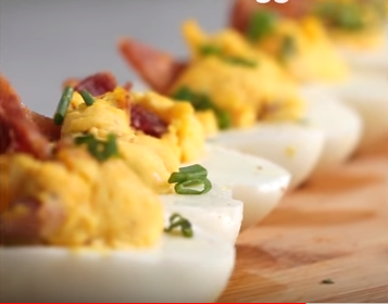 Начин на приготвяне: Нарежете бекона на ситно и запържете леко до златисто. Оставете няколко кубчета за декорация, а останалият смесете с жълтъците, заквасената сметана, настърганото сирене, наситнения лук и подправките. Напълнете яйцата и декорирайте с бекон и пресен лук.