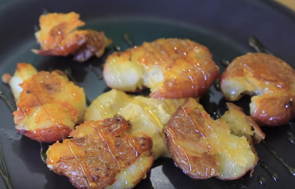 Ето сега ще обясним - за тази рецепта картофите първо се сваряват (използвайте дребни, мити картофи, които могат да се хапват с кората). После се притискат с вилица, така че да станат плоски и смачкани, но не и да се превърнат в пюре.