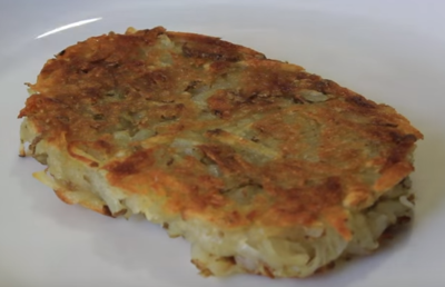 Намазнете тиган с масло или олио, сложете формичката и я напълнете с настъргания картоф, като притискате добре. Пържете до златисто. После махнете формичката и обърнете да се изпече от другата страна. И ето го резултата: