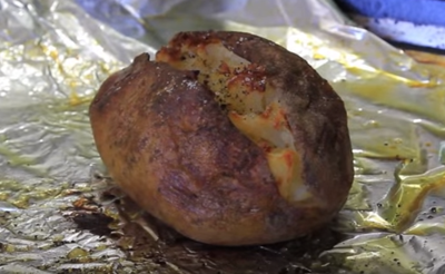 Увийте картофите във фолио и пъхнете във фурната да се пекат, докато станат меки. После срежете отгоре и разтворете картофа. С вилица леко раздробете картофа отвътре. Полейте с малко зехтин, сол, пипер и върнете във фурната да се пече до златисто. Когато го извадите, ще изглежда ето така: