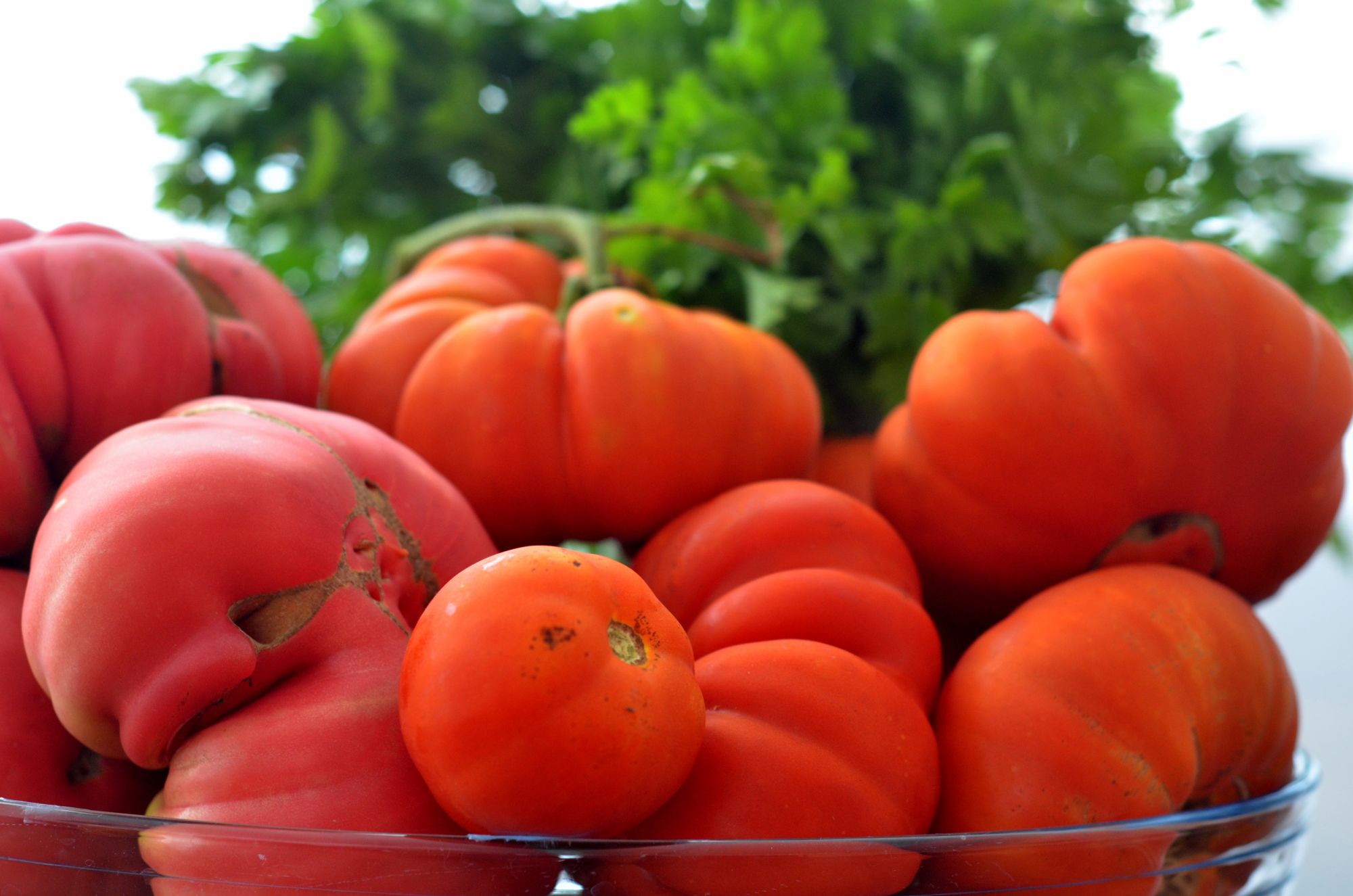 Започваме с тежката артилерия. Доматите ни са няколко сорта и в една кошница един с един не си прилича. Имат множество гънки, особено розовите домати.