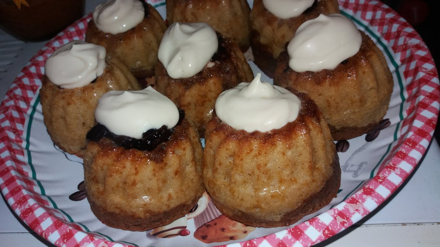 След като леко се охладят се вадят от формите и се обръщат с дупката нагоре. Дупката на кексчето се пълни със сладко и отгоре се слага по една лъжица заквасена сметана, предварително разбъркана с малко захар.