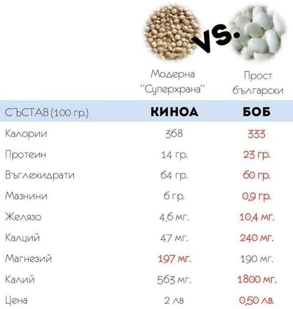Та, така - имаме от една страна супер био киноата и от друга - простия нашенски боб. И всеки би ни посъветвал да грабнем киноата, защото тя е супер храна и в никакъв случай не може да се сравнява с простия фасул.