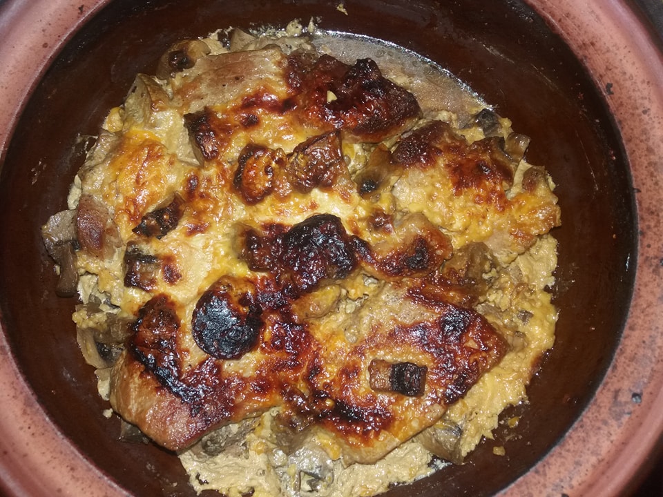 В гювеча наредете всички продукти по желан от вас начин – след всеки ред месо или гъби, добавяйте някакъв вид сирене. Накрая разбъркайте добре с телена бъркалка прясното мляко с цеденото мляко и излейте в гювеча. Добавете и малко вино.