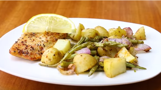 Измийте добре картофите и нарежете на малки парчета. Към тях добавете нарязания на ситно лук и почистения и нарязан зелен боб. Овкусете ги със зехтин, сол, пипер, чесън на прах и червен пипер. Сложете в тава, застлана с хартия за печене.