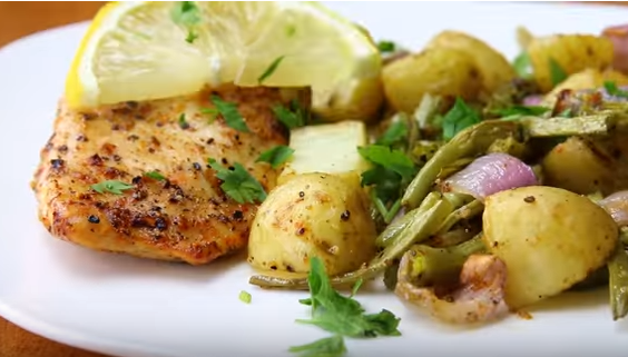 Овкусете и пилешкото със зехтин и подправки и сложете в тавата при зеленчуците. Печете около 30 минути в загрята на 220 С фурна.