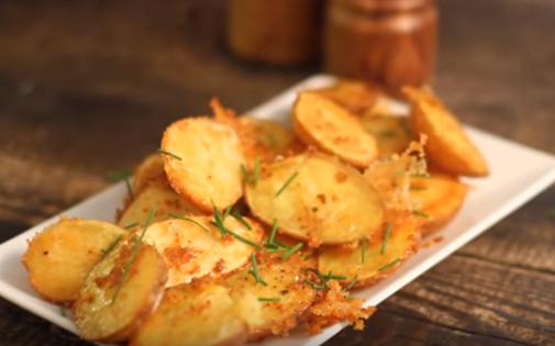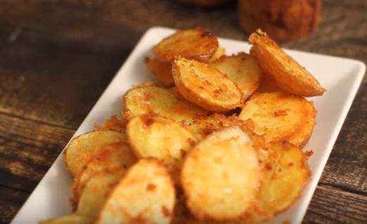 Разтопете маслото и го разпределете равномерно върху тавата, в която ще печете картофите. Върху тавата разпределете равномерно настъргания пармезан и подправките. Наредете картофките със срязаното надолу. Печете около 35 минути. После оставете да се охладят 5 минути в тавата и след това сервирайте.