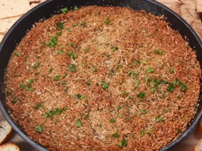 4. В подходящ съд изсипете първо сместа със сирена и разстелете добре, отгоре - тази с галета. Печете на 200С около 20 минути. Сервирайте с печени филийки.