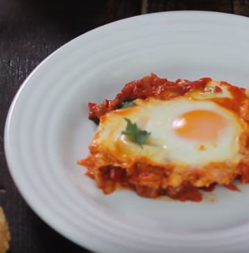 После чукнете яйцата върху соса и сложете капака на тигана. Оставете яйцата да се готвят 10-15 минути. При поднасяне гарнирайте с пресен магданоз или кориандър.