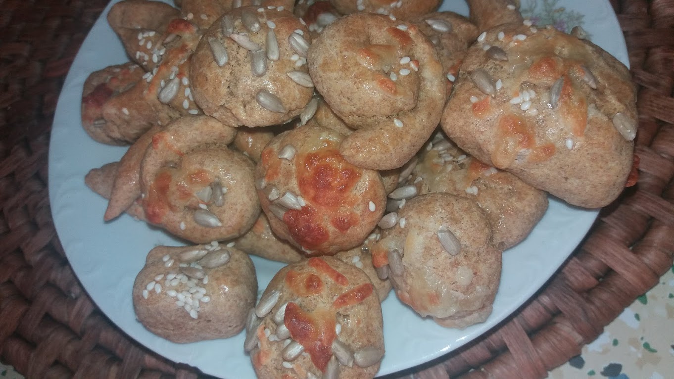 Нареждайте ги в тава, застлана с хартия за печене. Отгоре намажете с разбито яйце и наръсете с настърган кашкавал, слънчогледови семки и сусам.
