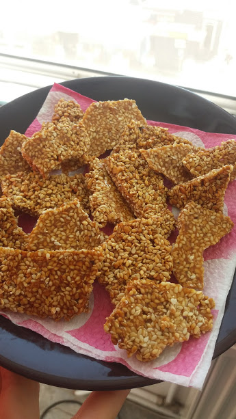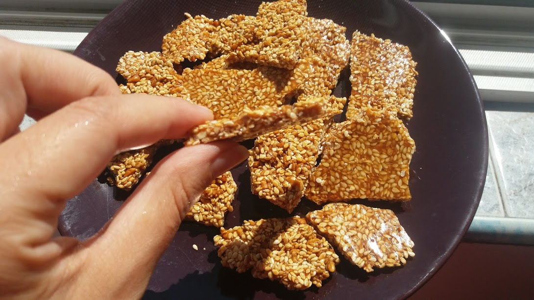 Когато се охлади напълно, се чупи на парчета и сусамките са готови. Колкото по-тънък е блатът, толкова по-хрупкави стават сусамките.