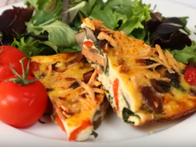 - Прехвърлете в тава. Залейте с разбитите яйца и прясно мляко. Отгоре наръсете кашкавала.