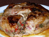 ПРОДУКТИ 500 гр. свинско филе 6 зелеви листа 200 гр. спанак 200 гр. гъби 200 грама кромид лук 2 печени чушки 1 ч.л. млян черен пипер 3 с.л .олио 1 ч.л. сол